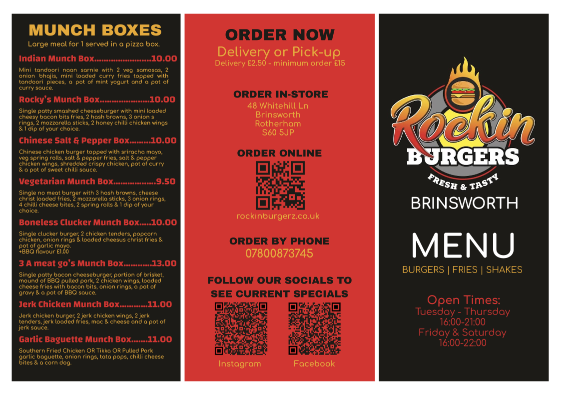 At Rockin Burgers, located at 48 Whitehill Ln, Brinsworth, Rotherham, this takeout destination brings an incredible lineup of mouth-watering burgers and munch boxes that will satisfy any craving. Their menu boasts a variety of offerings, including the towering chicken and beef burgers complemented by tempting add-ons like crispy onion rings, streaky bacon, and creamy cheese sauce. Customers rave about the generous portions and fresh ingredients, noting that meals are affordably priced—perfect for fulfilling a hearty appetite. The Indian and Vegetarian Munch Boxes have also garnered attention, encapsulating delightful flavors in a convenient format. Diners appreciate the remarkable service and the welcoming atmosphere provided by the friendly owners. With such positive feedback, Rockin Burgers has quickly established itself as a must-visit takeaway for burger lovers and those seeking quick, quality meals. Don't miss out; give it a try and experience the flavor explosion for yourself!